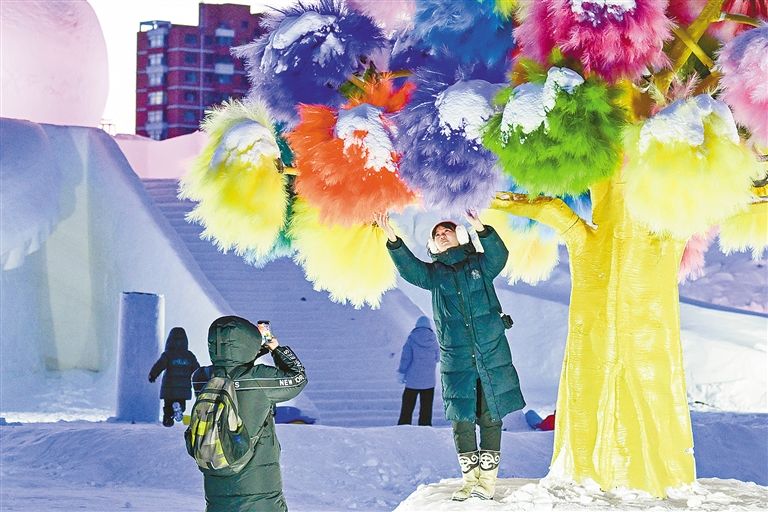 游客在呼倫貝爾“絨絨雪世界”打卡拍照。