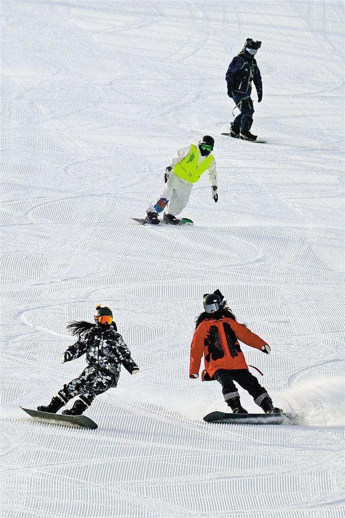 在牙克石鳳凰山滑雪場,滑雪愛好者飛馳在雪道上。