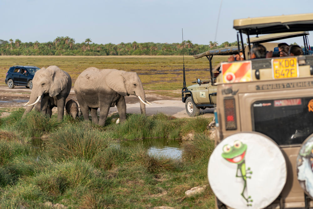 ↑游客在肯尼亞安博塞利國(guó)家公園乘車(chē)觀看大象(1月8日攝)。