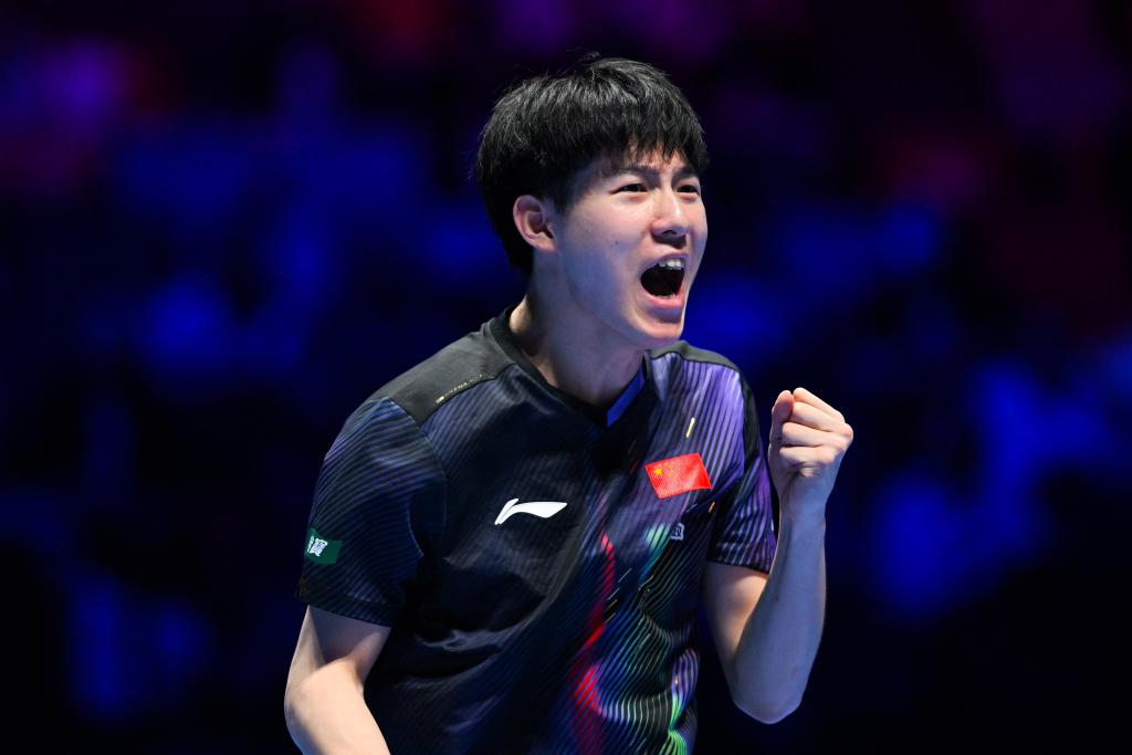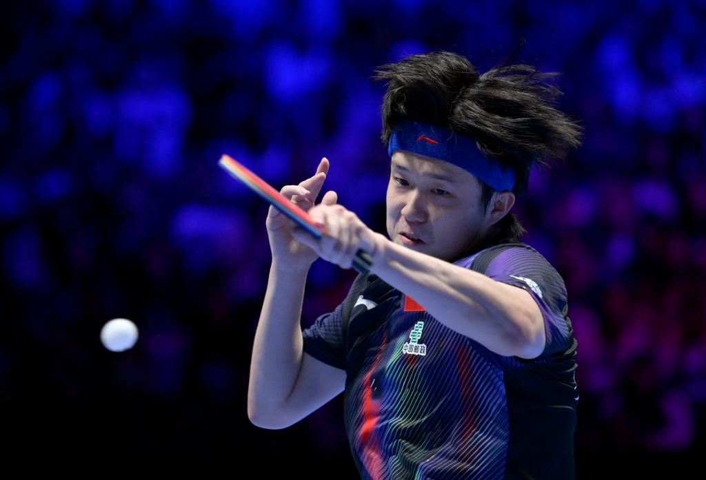 4月1日,中國隊選手王楚欽在比賽中回球。新華社記者 于洋 攝