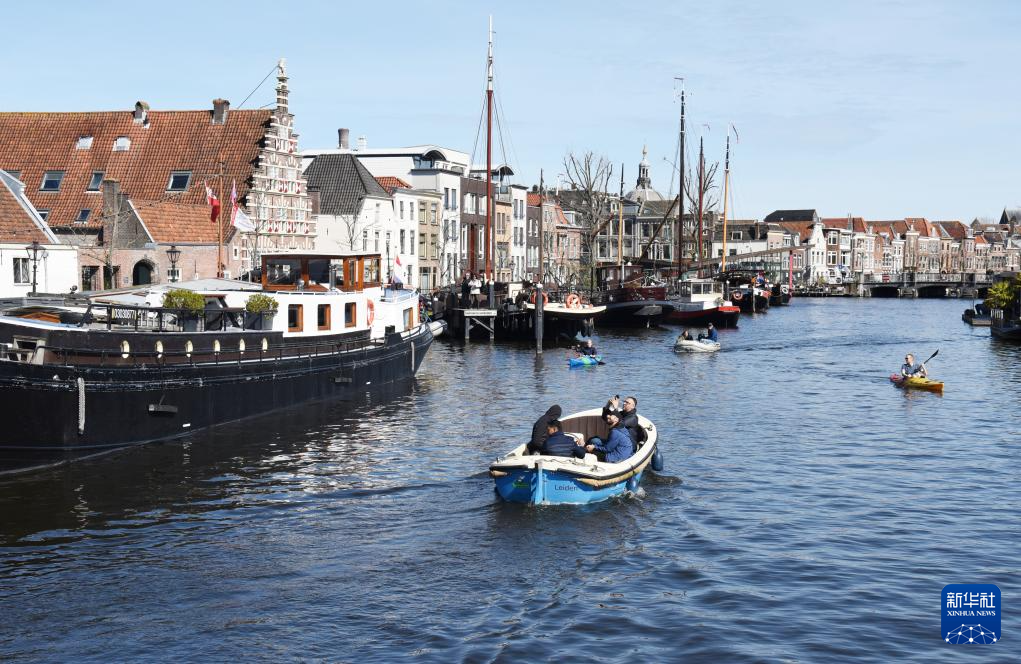 4月6日,在荷蘭萊頓,人們乘船欣賞城市風景。